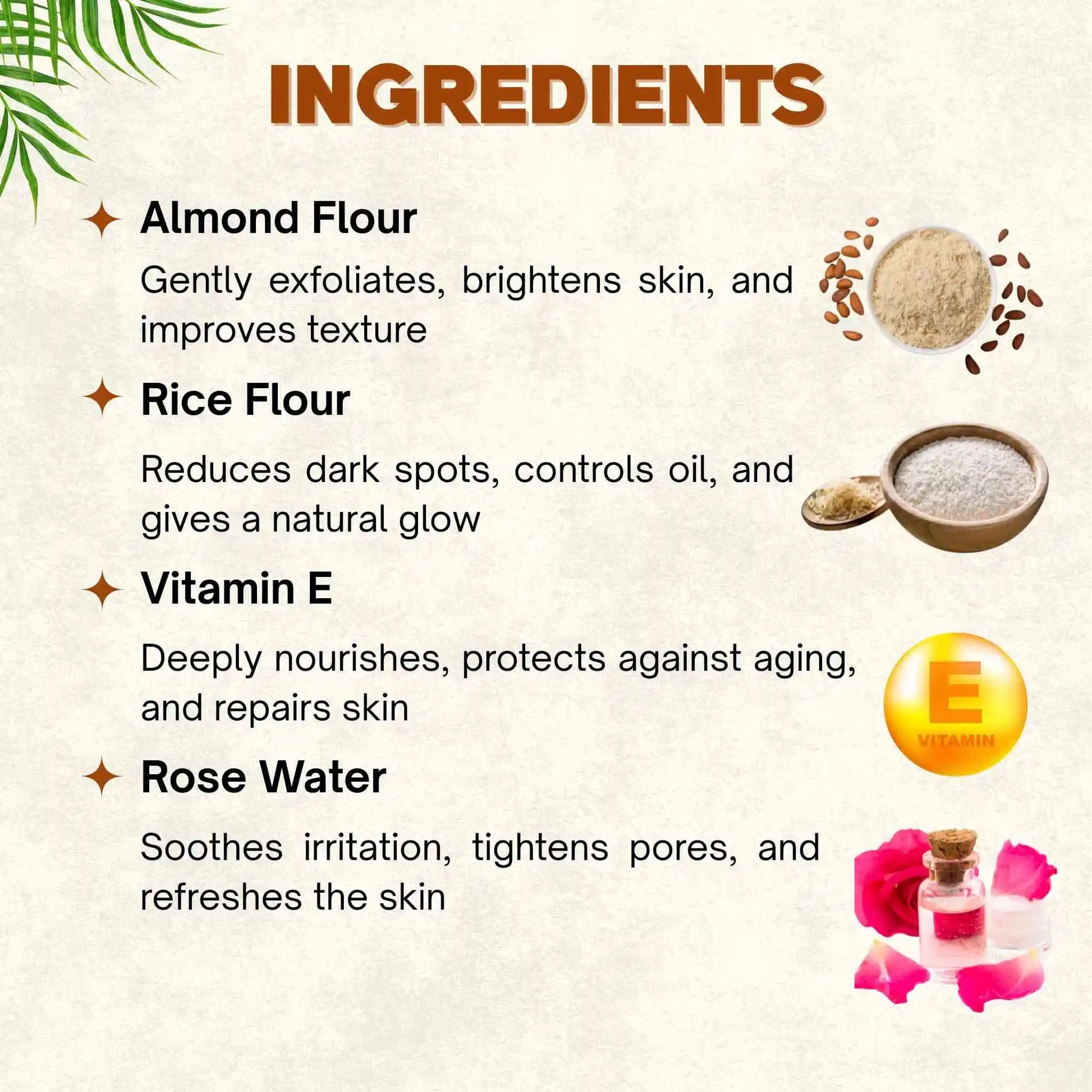 ✔ Rice Flour – Reduces dark spots, controls oil, and gives a natural glow.
