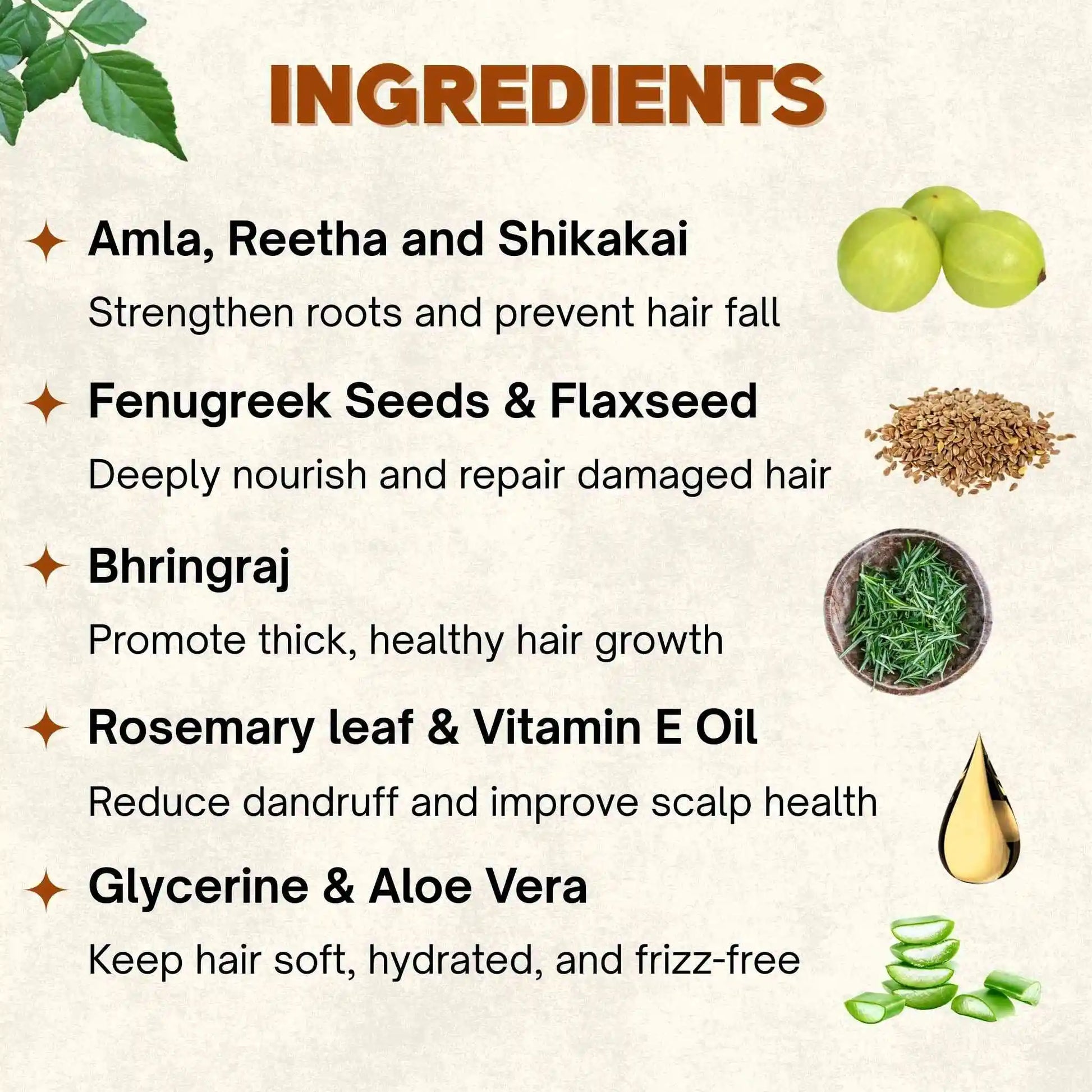 ✔ Amla, Reetha & Shikakai – Strengthen roots & prevent hair fall.